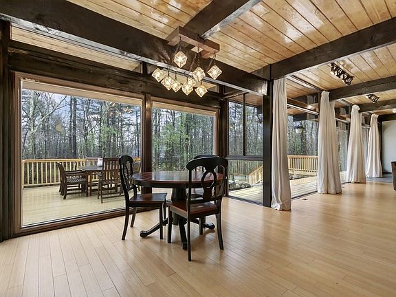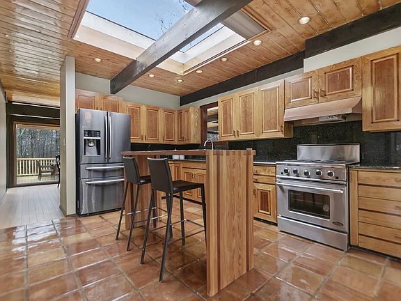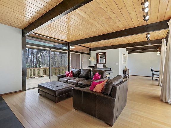 The tree canopy and birdlife are close enough to touch in this rare glass-walled architectural treasure. Open space and light characterize this midcentury modern, situated on a private, wooded lot perched above a winding country road close to the town center and commuter routes. With hardwood floors and radiant heating, the one-story layout puts everything at your fingertips, with an open floor plan equally conducive to private relaxation and entertaining. Watch the seasons change by the warmth of the energy-efficient wood stove, or sip drinks and stargaze from the wraparound exterior deck. Recent updates include a new roof and a full bathroom. Garage tucked below the house keeps the views pristine.
