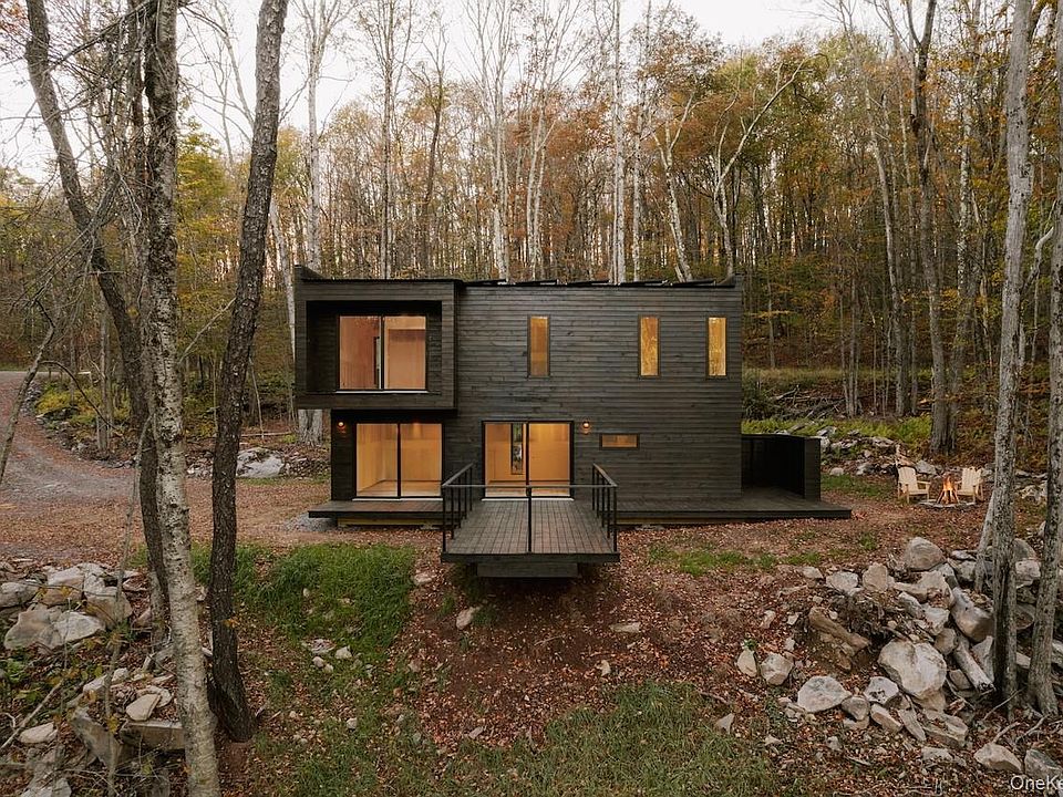 The 2.6-acre site offers total privacy yet remains minutes from North Branch, Callicoon, Roscoe, and Livingston Manor. A fire pit just off the deck invites starlit evenings, while a grassy clearing below opens to views of the house above and the surrounding forest.