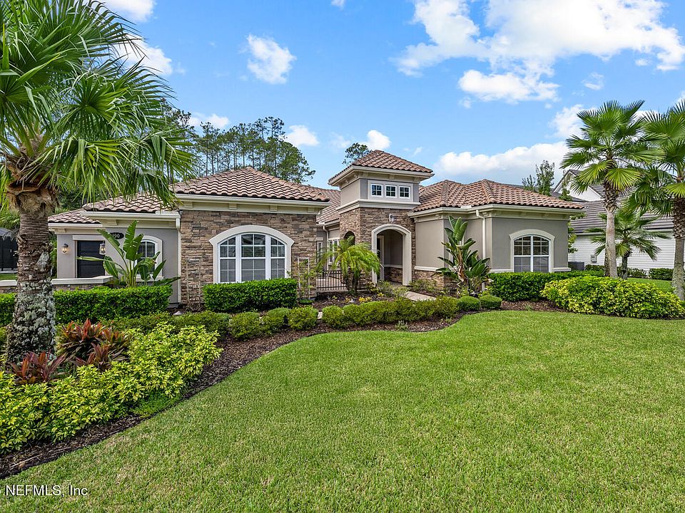 Located in the prestigious Island of Twenty Mile, just 5 miles from the beach and minutes from shopping and dining at Nocatee Town Center, this luxurious gated pool home is a true standout. Set on a private preserve lot, it features an open floor plan with 4 bedrooms plus 5th bedroom or office, 5 full baths, a half bath, and a spacious upstairs bonus room. 42'' cabinets with 24'' stacked cabinets, under cabinet lighting, chef's kitchen impresses with a large Quartz island, and a 6-burner gas cooktop with pot filler. Step outside to your private oasis with a resort-style pool, spa, and summer kitchen complete with Kamado Joe grill, cooktop, and bar seating. Additional upgrades include a 3-car garage with epoxy floors, wine cellar, tankless water heater, reverse osmosis system, custom closets, upgraded tile, soaring 12''-14'' ceilings, crown molding, and fresh paint inside and out (2023). This home blends elegance, comfort, and location like no other!
