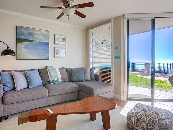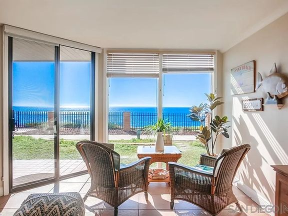 Vacation Rental - rates vary by season. Located on the border of Del Mar and Solana Beach, be prepared to immerse yourself in the unique coastal lifestyle only these two communities can provide. Just steps away from the Del Mar Shores Stairway to the sand, this ocean-view vacation rental is a beach lover's dream. After a day of sun and surf, retreat to your private oceanfront sanctuary with a cozy enclosed patio off the bedroom. Inside the unit, a beautifully updated bathroom invites you to rejuvenate, while the fully stocked kitchen is perfect for crafting meals or enjoying appetizers before heading to the Brigantine, a local favorite restaurant with crispy fish tacos, oysters, and cold beer. The ocean-view living room's expansive sliding glass doors transform your space into a seamless blend of indoor and outdoor living. Extra patio chairs allow you to soak in the sunset. Explore the gorgeous walking trails along the bluff with panoramic views of the surf and sand. Community amenities include a sparkling pool and spa. Short drive to all of San Diego's world-famous attractions including the Del Mar Racetrack. This property has been a vacation rental for several years with wonderful reviews (5 star average!) - Walking distance to the beach with dedicated community beach access - Lots of natural light and windows - Dedicated parking space in gated garage - Community Pool & Hot Tubs overlooking the bluffs - Community Washer & Dryer close to the unit