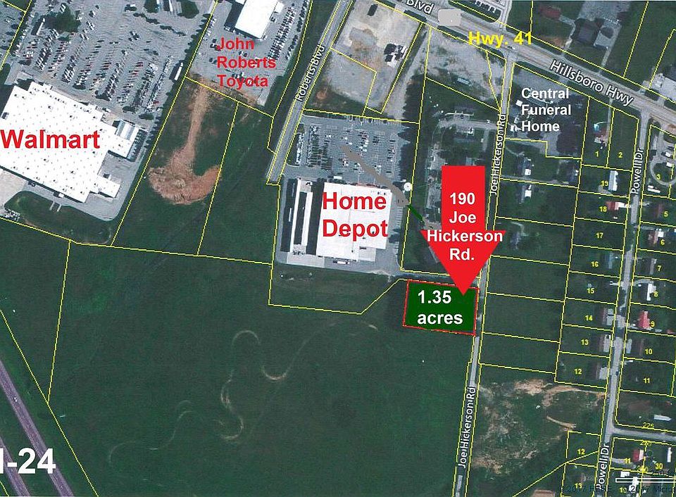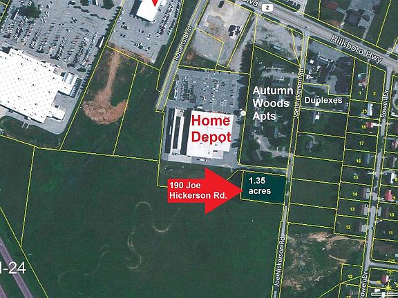 1.35 ac corner lot off Hwy. 41, 3/4 mile to I-24, Exit 114 w/I-24 visibility. Sits just past apartments, directly behind Home Depot. Approx. 180' of frontage on Joe Hickerson; 275' on Home Depot entrance. Perfect for business or multi-family. Electricity & water on property. 3/4 mile to shopping & restaurants. 1 mile to Bonnaroo & industrial park