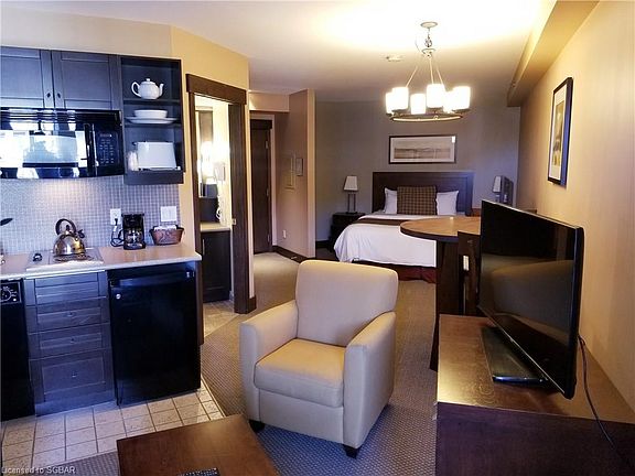 FABULOUS BACHLEOR SUITE IN THE HEART OF BLUE MOUNTAIN VILLAGE. Enjoy the village from the inside outward! Take advantage of having your own place in the centre of beautiful Blue Mountain Village located at the base of the ski trails. Balcony overlooks the pool and courtyard. Amenities include: year round heated-outdoor pool, hot tub, sauna, gym, Owners Lounge and underground parking. Fully furnished bachelor suite is conveniently located near all amenities. HST may be applicable, 2% Village Association entry fee applies. Utilities included in condo fees. This suite is not in the Blue Mountain Resort Rental Program. Refurbishments are required to re-qualify for the rental program.