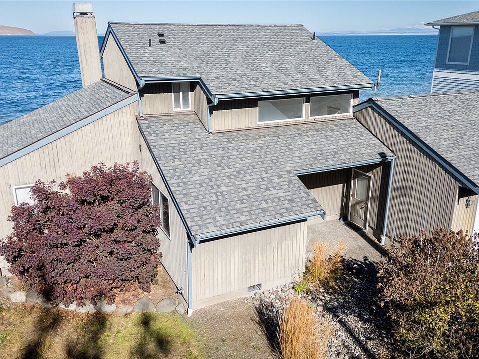 Own your own beach! This rare, no-bank waterfront home on the Strait of Juan de Fuca is move-in ready and features spectacular, panoramic views of the Strait, Protection Island, Mount Baker, and the shipping lanes from nearly every room. A recent investment was made into an engineered and permitted bulkhead for longevity and peace of mind. The freshly painted, 2-bed/2-bath contemporary boasts custom touches like Corian counters, a heat pump, and all appliances. The luxurious primary suite is a true retreat, offering a sitting area, large ensuite bath, and a private balcony. Multiple expansive decks for watching marine wildlife and passing ships. . Situated near beautiful Miller State Park—offering miles of hiking and bike trails.