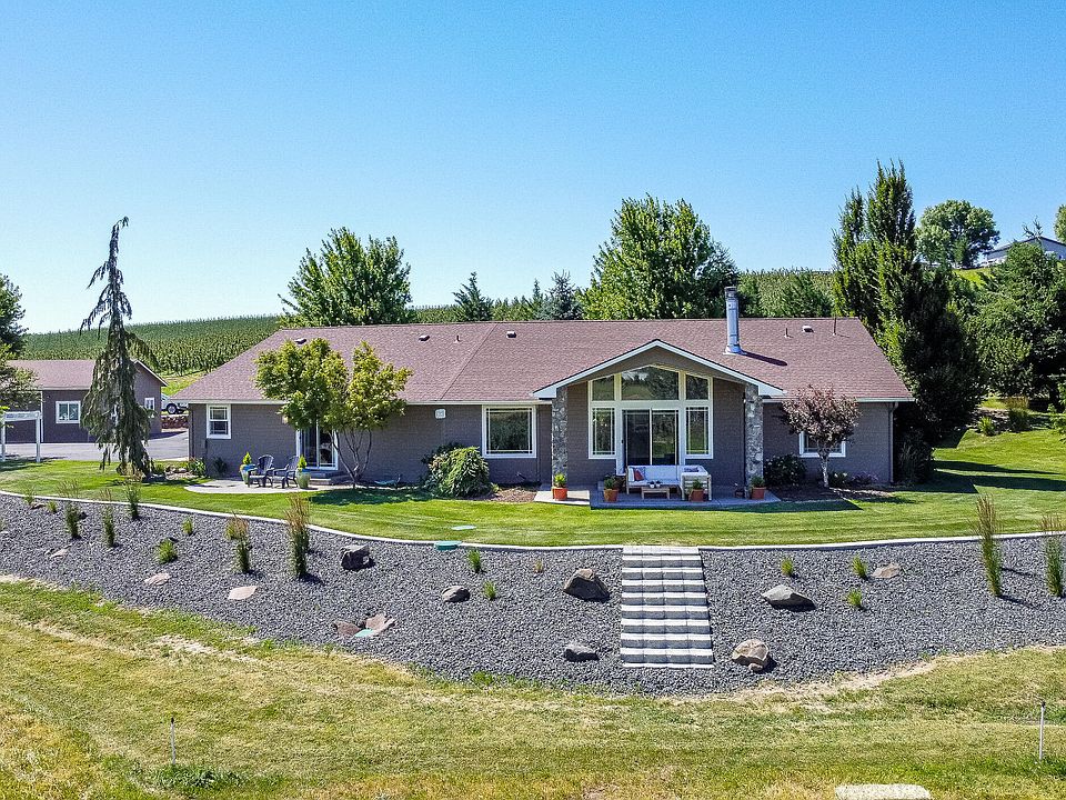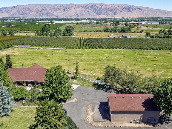 Tucked away from street view, up the paved road, a tastefully renovated ranch/rambler with views through large picture windows that capture the sunrise and sunset from Cowiche to the Tieton Valley with a backdrop of an everchanging Mt. Cleman, sits on 8.32 acres of agriculture and new landscaping. Approaching the home there is a largely insulated shop with an office, workbench, and space for farming tools and vehicles. The land is irrigated, has underground sprinklers, as well as a new well and drain field. The home itself has a split, two-car garage with a new water-softener, electric heat pump and furnace with an annual maintenance warrantee. Outside find a large patio space for watching the nearby pasture, an attached BBQ, a beautiful stone fireplace/chimney, stylish rock borders and walkway, and a multi-use potting shed. The property has over 6 acres of farmed hay! The property also has five cherry trees, one grape vine, and bordering the property to the South are cedar trees. The interior has been completely remodeled to perfection with new paint, large crown molding, wood floors, granite/tile throughout, and white cabinetry. The floorplan opens to a kitchen conducive for a chef, with new appliances including double ovens, a built-in stove, large white farm-sink, and L-shaped island great for entertaining. The vaulted ceilings make it spacious and bright! You feel like you stepped right into a showroom. The isolated master suite has a porch of its own, allowing for quiet coffee and reading breaks all your days, along with a private bathroom, dual vanities, and ample counterspace. Other great features include gutters with heated tape. If you love outdoor hobbies, travel, adventure and a peaceful place to come home to, there is a wow factor here in Tieton you will not want to miss!