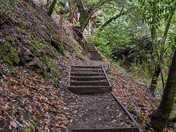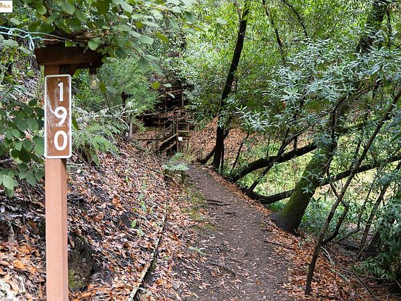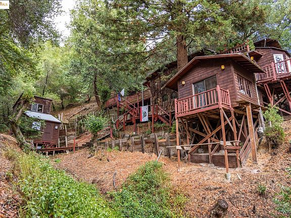 Hidden in the wooded folds between Oakland and Moraga, this former Stationmaster’s home is one of Canyon’s most eclectic retreats, a redwood cabin perched above a ravine where light, air, and creativity converge. Reached by a narrow, illuminated footpath that winds through the trees, the home feels both secluded and alive with its surroundings. Once rumored to host musicians of the psychedelic era, it remains infused with that spirit of originality and calm. Inside, rustic board-and-batten rooms open to forest-view decks. The kitchen’s vintage Wedgewood stove and peace-sign floor recall Canyon’s freewheeling past, while the window-wrapped living room and river-rock fireplace invite reflection and connection. Three bedrooms are linked by ship-style ladders, adding to the home’s character and sense of adventure. Water is drawn from a private spring; electricity and propane service the essentials. The meditation loft above the washhouse (with washer & dryer) provides a quiet refuge for writing, painting, or simply listening to the seasonal creek. Just minutes to Moraga, Oakland, and San Francisco, yet a world apart, with an authentic blend of history, artistry, and nature.