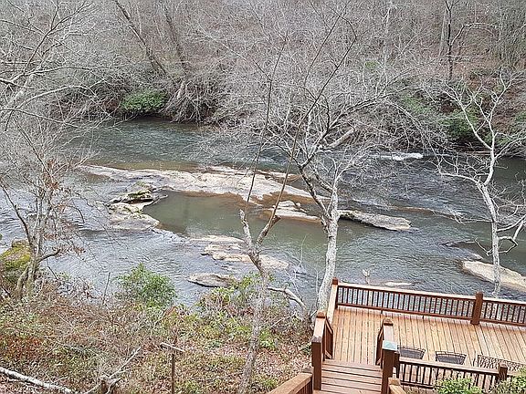 Beautiful views on tthe Soque river rushing over rocks. Stairs going to deck on river!
