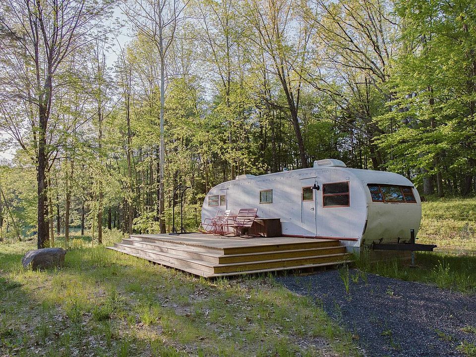 Welcome to Camp Freehold! This ultra charming and refurbished 1955 Royal Spartanette camper set on 9.7 peaceful acres with sweeping views of the Windham-Blackhead Range Wilderness is a nature lover’s dream. Within this private parcel, you’ll find TWO ponds, a creek, and approximately 750 feet from river frontage on the Basic Creek. Step inside the camper and be transported to 1955 amongst its curved, wood clad walls, mid century kitchen, built-in storage, and all chrome bathroom. Imagine your friends pitching tents on the property all summer long. Polaroid and Super 8 film encouraged, but not required. This fun site is being sold fully furnished, just bring your toothbrush and enjoy the Catskills this season. Some fun facts about the Spartanette: This was a product of the Spartan Aircraft Company of Tulsa, OK. Spartan built aircraft for WWII through the late 1930s, until after the war when Jean Paul Getty acquired the company and took it in a new direction, campers, all while keeping the sleek and modern design of their aircraft heritage. There are 3 ideal build sites on the property, one being where the Spartanette currently sits, and where well, septic, and electric were all freshly installed in 2022. The second obvious build site would be below the camper, near the pond with a view. And third would be behind the camper in the wooded area that needs clearing - or just keep it as-is for privacy. Camp Freehold is 9 mins from the towns of Leeds and Cairo, and its sweet attractions like Gracie’s, Hartland Coffee Shop, Catskill Bakery and Market, Casa Susanna, and Camptown. Only 13 mins from upstate institutions like Pidgin, Gardenheir, and Glen Falls House. And of course just 20 mins to the Village of Catskill, which has a deep creative community along main street with places like Foreland Art Space, Made x Hudson Shop, Subversive Brewing, Crossroads Brewing, Goodies Bagels, Willa’s Cafe, and so many more. Skiing is 14 mins down the road at Windham, or 30 mins to Hunter. Sold as-is and furnished. CO is not in place for the camper, as it is a temporary structure. Cash preferred, but not required. This property has never been short term rented, but estimated income is $40k annually.