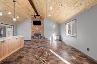 Open layoutModern fixturesPeaceful cabin atmosphereMetal roofVaulted wood ceilingsRich wood trimSpacious island