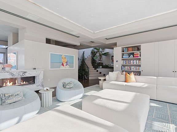 A key-locked elevator delivers you directly into an immense great rooman airy, greenhouse-like space anchored by a sculptural anthracite stone and glass gas fireplace. Eleven-foot glass walls rise and angle into skylights that sweep around the perimeter, infusing the living and dining areas with an ever-shifting play of sunlight. The adjacent south-facing office, insulated by pocket doors, provides a comfortable extension of the entertaining spaces. A refined powder room sits quietly off the entry gallery.