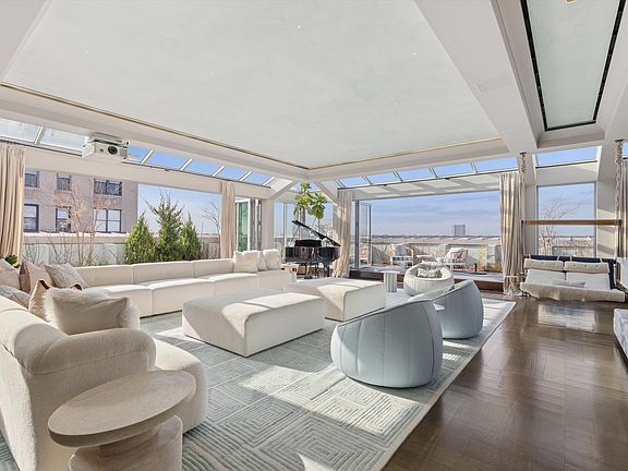 Presiding over more than 4,500 sq. ft. of interior space and wrapped in glass, this full-floor penthouse is a light-filled sanctuary with 360 vistas, refined contemporary design, and its own private parking space. Envisioned by the acclaimed Spivak Architects, the home offers 4/5 bedrooms, 6 bathrooms, and an astonishing 3,000 sq. ft. of outdoor living across two dramatic levels. Resting atop the landmark Beaux-Arts architecture of 190 Riverside Drive, the residence features retractable glass walls that dissolve the boundary between indoors and out, opening to an expansive terrace with cinematic views of the Hudson River, the George Washington Bridge, and the city skyline.