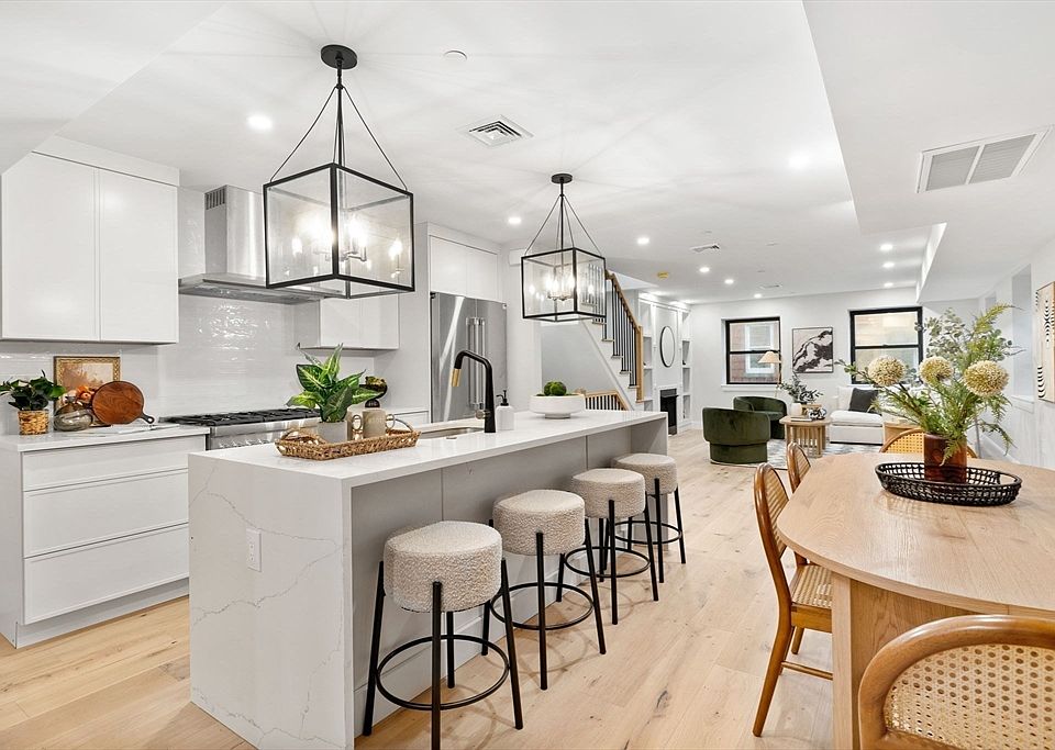 New Construction penthouse 3 bed 3 full bath with 3 private decks in stunning federal townhome in the heart of boston's historic north end. A shell renovation of one of the most architecturally striking homes in the North end brings a seamless blend of modern luxury/amenities with timeless historic charm to this stunning luxury home. With windows abound, The interior gets amazing light offering a dramatic wide open feel to the sprawling living kitchen dining area. The sharp designer finish package caters to the most discerning buyer. Beautiful kitchen w thermador appliances & 11 ft island w bb bar. Upstairs Two king size bedrooms feature feature luxurious en suite baths, with the primary bedroom boasting dbl vanity & glass walk in shower. The balcony off of the primary bedroom offers a great space for fresh air or morning coffee. Upstairs off of the penthouse the large deck offers great outdoor space to entertain & beautiful views of city skyline, North end, & Old north church.