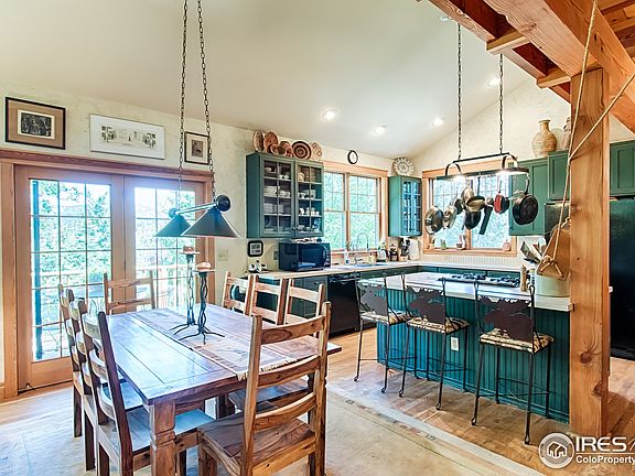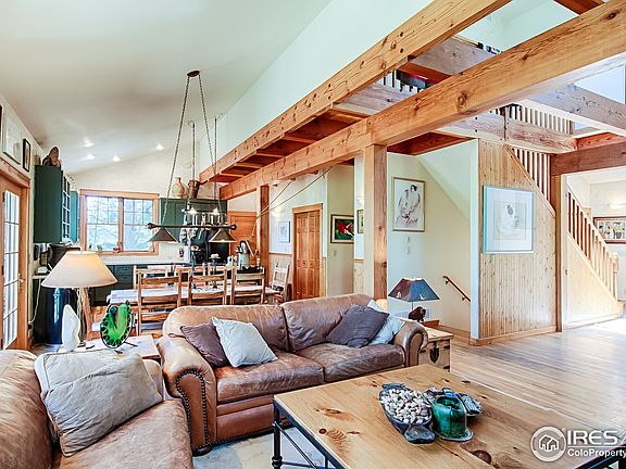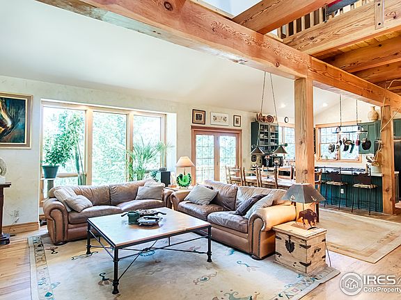 Mountain Elegant home boasts high level wood finishes, Timber post & beams, built-ins, soaring ceilings, open floor plan, wood floors & Pella windows.Privately located on a charming 1 acre wooded lot, backing to Ntl forest&leading to Switzerland Park trailw/stream.Only 20 min to Boulder this home affords a private natural setting close to Boulder&Nederland.Expansive wrap around front and read deck,oversized 2 car detached garage, fenced dog area. One of the best homes in much loved St Anotns.
