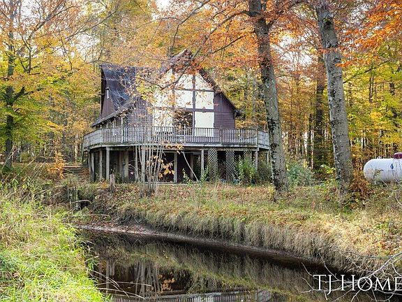 Imagine owning 10 acres of pristine, private land with creek frontage, accessible by a secluded drive and never before offered on the market! This unique A-frame home combines the charm of a cozy cottage with the grandeur of a two-story, stone fireplace made out of California Driftwood Stone. The home's thoughtful design maximizes its stunning natural setting, with the main living space elevated to embrace the changing views of the creek and wetland area. While this home awaits renovation, it presents a blank canvas brimming with potential. The unfinished lower level is perfect for ample storage or workshop space, designed to .... handle the natural wetlands. Opportunities like this don't come often, your off-the-grid haven awaits! Make it your own secluded retreat where privacy, nature, and opportunity come together.