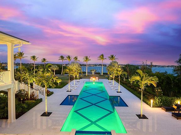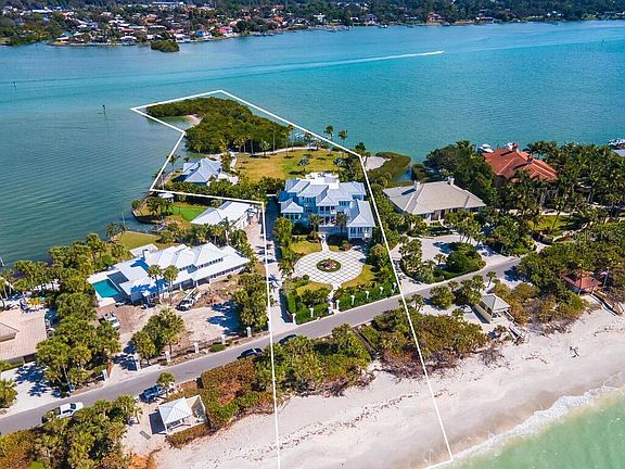 Very rarely does a property come along that truly takes your breath away. An aerial view of this estate immediately reveals the grandeur of the land alone, one of the largest lots on the island of Casey Key. Encompassing nearly 3.5 acres between the Gulf of Mexico and Sarasota Bay, with 120 feet of direct Gulf beach frontage and well over 1,000 feet of bay frontage, this resort-like compound is the perfect island getaway. The impressive estate, completed in 2018, was brilliantly developed to deliver an absolute balance between architecture and design while taking advantage of the impressive setting to create a complete island oasis including the main house, guest house, Olympic-sized swimming pool, spa, boat dock, enormous backyard and a private canopied nature preserve leading to two private beaches on the bay. Designed by John Cooney of Stofft Cooney Architects from Naples and constructed by award-winning Sarasota home builder Michael K. Walker, this estate was curated for comfortable entertaining and a relaxed island lifestyle. The main house, with nearly 9,600 square feet of indoor/outdoor living space features multiple gathering spaces that flow seamlessly together through the use of expansive walls of glass. Custom millwork, rich wood and stone flooring, exotic marble and granite, natural Florida coral stone, a strong cohesive color palette, textured wall coverings, and custom-designed and installed window treatments are just some of the incredible features that make this home special. Complementing the interior, the extensive outdoor spaces include multiple covered and uncovered seating areas, a heated saltwater pool with spillover spa, fire pit, bocce ball court and extensive lushly landscaped grounds. The guest house/party pavilion is the icing on the cake and boasts a great room, full bath, and an amazing 40'x40' covered patio with an oversized fireplace and long water views of the bay/Intracoastal Waterway. The entire property is fully automated by Lutron smart home lighting and integrated security and fire detection system. A 10+ car drive-through garage, hurricane impact-rated windows and doors, and a 22kwh generator that powers most of the house complete this incredible estate property.