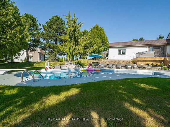 A truly exceptional luxury estate set on 50 acres of rolling hills, serene fields, and breathtaking landscapes. Nestled at the borders of Stouffville, Uxbridge, and Pickering, this property offers a rare combination of tranquility and privacy while remaining close to local amenities. A long winding driveway provides a sense of seclusion while guiding you through picturesque views to the home. The light filled open living area boasts 12 foot ceilings, exposed beams, and an antique style brick fireplace. Wall to wall windows frame panoramic west facing views of the countryside. The chef inspired kitchen combines high end appliances with European style touches and a generous island, perfect for casual dining or entertaining. An expansive deck with glass railings extends the living space outdoors, offering sweeping views of the rolling hills and, in the distance, the Toronto skyline. The luxurious primary suite features a walk in closet, built in wardrobe, and a five piece ensuite. Large windows and a walk out to the east lawn bring in the morning sun, creating a serene retreat. Three additional bedrooms and a contemporary five piece ensuite provide comfort for family and guests. The walk out basement includes a recreation area, two offices, a full bath, and a large bedroom currently used as a sewing room, all with stunning west facing vistas. Outdoors, six acres of maple bush, a seasonal pond, and a charming barn with original paddocks and vintage nameplates add character and potential. An oversized garage accommodates three large trucks and includes hydro and roughed in heated floors. Additional amenities include an inground pool, hot tub, and beautifully landscaped gardens. The home has received extensive updates, including plumbing, electrical systems, HVAC, roof, and spray foam insulation, along with energy efficient geothermal heating and in floor heating for comfort and low operating costs. To truly appreciate its beauty, you must come see it!