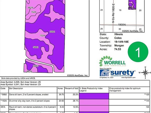 224.28± acres of high-quality farmland as 3 tracts within 2± miles of each other in Coles County, IL! These three tracts can be purchased together, separately, or in any combination to allow buyers to go after the acreage that suits them best. All tracts have good access and farmability. Begin farming immediately at closing, as they have open tenancy for 2026. Each tract is being offered at $15,850 per taxable acre. The farms are located approximately 3± miles S of Hindsboro, 6± miles W of Oakland, and 2± miles N of Bushton. Tract 1 is 77.00 taxable acres in Morgan Township, 97% tillable, made up of predominantly Dana and Drummer soils to give an average Productivity Index Rating of 130.8. Tract 2 is 27.28 taxable acres that are 98% tillable in Seven Hickory Township with an average Productivity Index Rating of 131.5. Directly across the road from Tract 2, is 120.00 taxable acres that will be offered as Tract 3. This tract has an average Productivity Index Rating of 136.4.