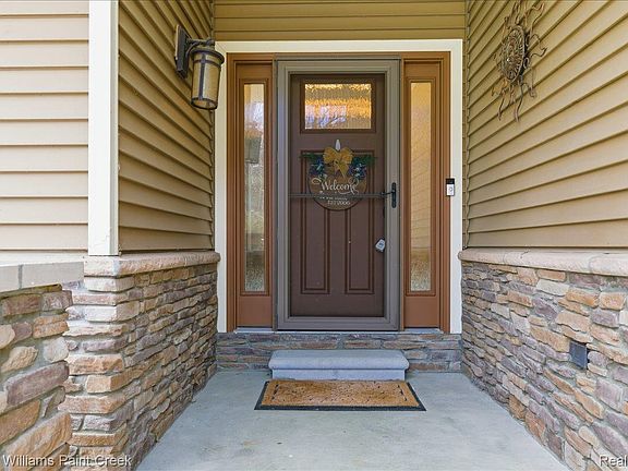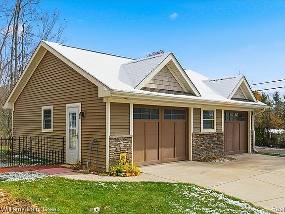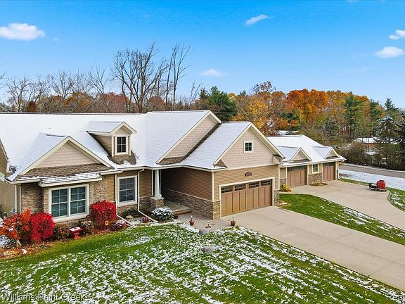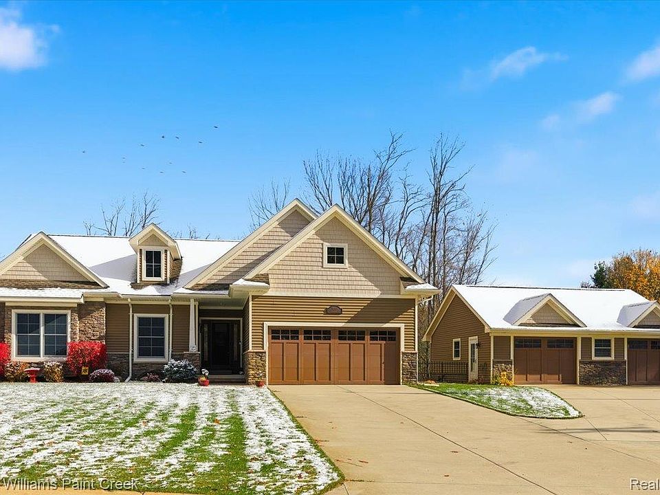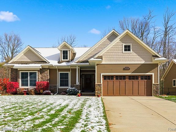 Welcome to this stunning 2015 custom-built ranch nestled on a beautifully wooded 1.36/acre lot surrounded by lakes. This home features an open floor plan with 3 spacious bedrooms, 2.5 baths, and high-end finishes throughout. The gorgeous kitchen impresses with Cambria quartz countertops, stainless steel appliances, a large island, under-cabinet lighting, and abundant storage including a walk-in pantry. The dining area is surrounded by windows overlooking the natural landscape, and the great room centers around a beautiful gas fireplace. The inviting 3-seasons room extends your living space and will be your favorite spot in the home. The basement has vinyl flooring throughout, two egress windows, and is plumbed for an additional bathroom—perfect for future expansion. Additional highlights include 9 foot ceilings, Anderson windows, a whole-house generator, and an in-ground sprinkler system. Outside, enjoy a 2-car attached garage plus a matching 30x28 heated outbuilding with water and floor drain—ideal for hobbies, storage, or a workshop. Enjoy the charm of “up north” living with daily wildlife sightings with the convenience of city amenities. Huron Valley Schools.