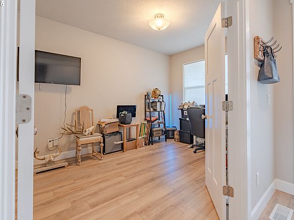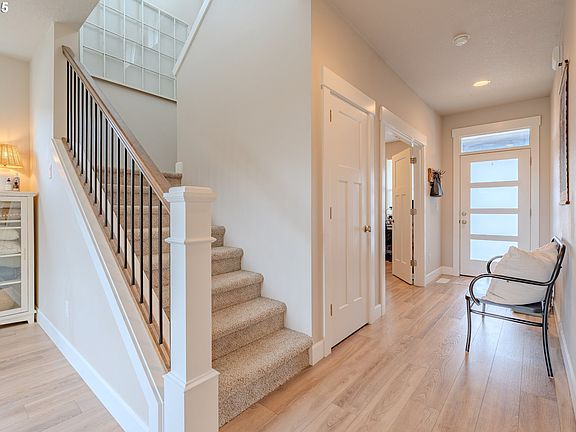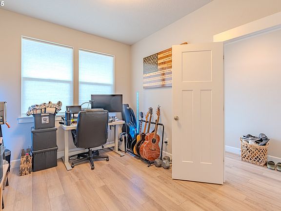 Stylish inside and out! From its contemporary Prairie-style architecture to the striking stacked-stone fireplace surround, this 2019-built home blends modern design with everyday comfort. Offering 2,110 sq ft of thoughtfully designed living space, it includes 4 bedrooms and 2.5 bathrooms. The main level features an open floor plan with high ceilings and warm-toned, easy-care Luxury Vinyl Plank flooring throughout. Off the foyer, French doors open to a spacious office/flex space. The great/living room is the heart of the home - bright and inviting with a large picture window overlooking the backyard and a gas fireplace framed by beautiful, stacked-stone as the focal point. The kitchen seamlessly combines style and function with sleek quartz countertops, an eating bar, pendant lighting, Shaker-style cabinetry, a pantry, and stainless-steel appliances. Sliding doors from the dining area open to a large, covered patio – allowing for tons of natural light and easy indoor/outdoor living. Upstairs, you’ll find 3 good-sized bedrooms plus a spacious owner’s suite featuring a large spa-inspired ensuite with a dual-sink quartz vanity, soaking tub, separate shower, and walk-in closet. Outdoors, you will find a manicured yard, with the backyard fully fenced and complete with a covered patio, firepit, raised garden beds, and plenty of space to relax or play. An attached 3-car garage provides ample space for vehicles, storage, or hobbies. Conveniently located near schools, parks, and all that downtown Battle Ground has to offer - dining, shopping, and more - this chic, functional home is move-in ready. Welcome Home!