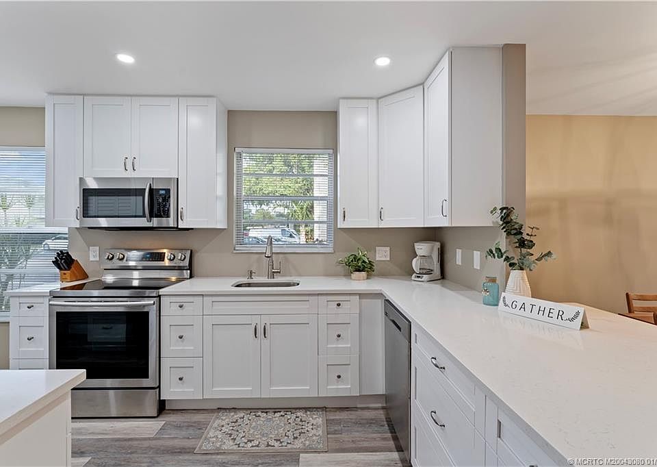 This recently remodeled, beautiful first floor 2 bedroom, 2 bathroom, corner unit condo is located in the great community of Tierra Verde. This home has been updated with white wood soft close cabinets, complete Samsung stainless steel appliances and quartz countertops. It has an eat in kitchen, as well as an eat up bar. Featuring newer bathrooms, luxury waterproof vinyl plank flooring throughout, an oversized covered Florida room/patio and full-size washer & dryer, this home is move in ready. Tierra Verde is a pet friendly, all age community allowing small trucks and assigned parking. This property is investor friendly and immediate rentals are allowed. The association dues include Cable, Water, Lawn Care, Building & Roof Maintenance as well as the amenities on property. This is a great & convenient location to Shopping, Restaurants, Cafes, the Lyric Theater and all things historic downtown Stuart offers.