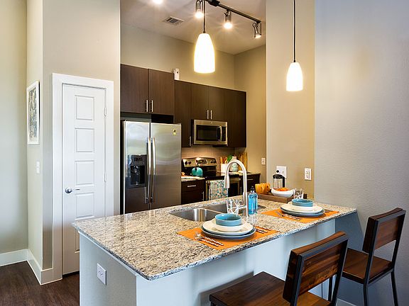 It all comes together at our luxury Mueller Park apartments. Walkability is effortless and park space is right across the street at Mueller Lake Park. Everyday errands can be knocked out at Mueller Town Center and other surrounding retail while special nights out come easy with a bevy of local restaurants from which to choose. Sleek apartment interiors featuring high ceilings, MasterWood plank flooring, and spacious balconies and patios make these park-side homes as elegant as they come. Residents here also stand to reduce their environmental impact, as the Mueller neighborhood was named the world's largest LEED Gold neighborhood, and our community itself is LEED Platinum.