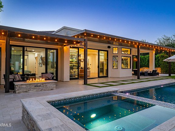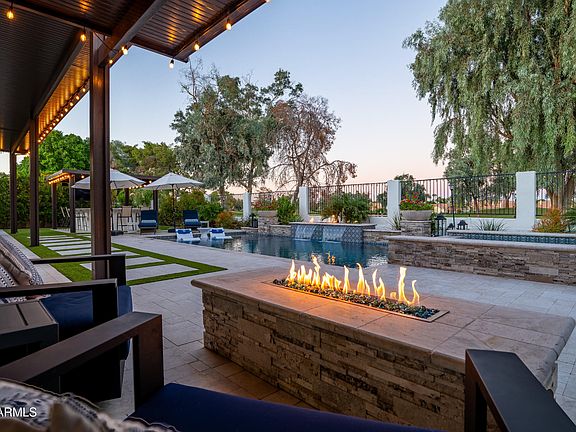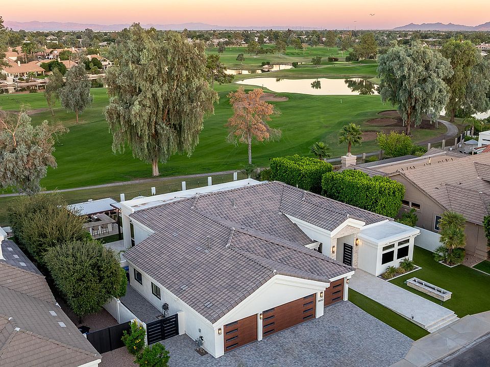 Welcome to modern luxury living with this stunning, single-level masterpiece, thoughtfully remodeled and expanded in 2022 to perfection and ideally situated on the Ocotillo Golf Course! This open-concept home showcases a spacious greatroom floorplan with multiple arcadia sliding door systems that seamlessly connect the indoors with the breathtaking outdoor retreat. Enjoy resort-style living with a stunning pool and spa, dual gas firepits, an outdoor kitchen, and expansive patios - all framed by sweeping views of the golf course and lakes for unforgettable sunsets. Inside, the home exudes sophistication with a high-end remodel featuring custom cabinetry, an expansive quartz island, a hidden walk-in pantry, and top-of-the-line appliances. The split floorplan offers three spacious bedrooms plus a dedicated office, providing both privacy and flexibility for modern living. The 4-car garage with custom flooring and EV charger completes this exceptional home, blending luxury with functionality at every turn.