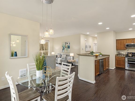 Light, bright, and wonderfully private, this immaculate 2-bedroom, 1.75-bath condo in the highly desirable Snohomish Station complex is a true delight! A main-floor corner unit with tall nine-foot ceilings, it enjoys lush, green territorial views of protected native growth that provide exceptional privacy. While you enter at street level, the side and rear of the home sit above grade due to the natural topography, giving the living spaces and bedrooms the elevated feel of a second-floor retreat. The well-designed kitchen offers generous storage, excellent counter space, stainless appliances, and a double oven, opening to a charming dining nook and inviting living room with a cozy electric fireplace and abundant green views. Hardwood floors, wide hallways, and wide doorways support an open, accessible layout, with no stairs from the attached garage and none inside—an increasingly rare and valuable feature. A covered deck invites you to enjoy the serene setting, while a one-car attached garage offers extra storage and shelving. Freshly painted, fully inspected, and with no special assessments, this exceptional home is ready to enjoy!