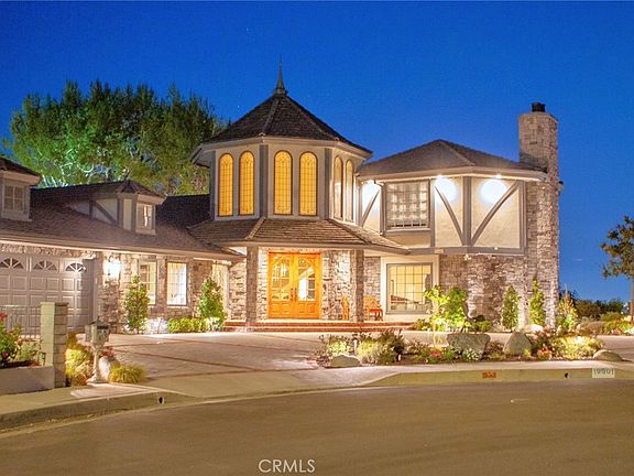 Custom, entertainer’s home, nearly 4,000 sqft, w/amazing valley & mountain views on quiet cul-de-sac in Porter Ranch. Fantastic curb appeal w/circular drive & brick ribbons. RV parking space for up to 40’. Covered front porch leads to double doors w/arched window & opens to formal, 2-story entry boasts leaded & etched glass, clerestory windows, decorative niches, & graceful, floating, curved staircase up to upper story. Blending comfort w/old-world charm, aesthetic touches, and upgrade LED lighting throughout. Step down, formal living room has stately fireplace & contemporary French doors opening out to backyard. Formal dining room has decorative tray ceiling & built-in sideboard w/granite counter & display cabinets. Kitchen is both beautiful & functional w/high vaulted ceiling, brick columns, white cabinets, granite countertops & backsplash, stainless steel appliances, including a 48’ Viking range, & wonderful octagonal island. Sunny, breakfast area offers walls of windows, topped w/ decorative glass, to bring in great views of yard & valley beyond. Comfortable, informal family room is perfect for hanging out w/friends or family, open to kitchen area & boasting tray ceiling & custom built-ins. Convenient powder room is perfect for guests. Office/library has custom built-ins & diamond mullioned windows (could be converted into additional bedroom.) Two good-sized bedrooms w/window seats, share a beautifully appointed, updated hall bath. Primary suite is true retreat w/views of mountains, vaulted ceiling, enormous walk-in closet, French doors to the back patio. Luxurious, en-suite bath has dual vanities, granite countertops, Pella windows, enormous shower, & separate, jetted tub. The house is mostly one story, however, upstairs, in the turret, is a delightful additional living area w/cedar beamed ceiling, large brick fireplace, & Pella French doors out to balcony that soaks in surrounding valley views. Could be 4th bedroom. Outside is generous yard on 13,835 sq ft lot offering patio, pool, firepit, & drought conscious turf. Extensive LED landscape lighting showcases this special home at night. Dedicated laundry room. The 2-car garage is completely finished w/epoxy floor, custom built-in storage cabinets, work bench & utility sink, plus finished attic space w/storage cabinets for additional 325 sqft of insulated storage. Meticulously maintained, pristine, and well situated near shopping, dining, recreation, & entertainment. Don’t let this one pass by.