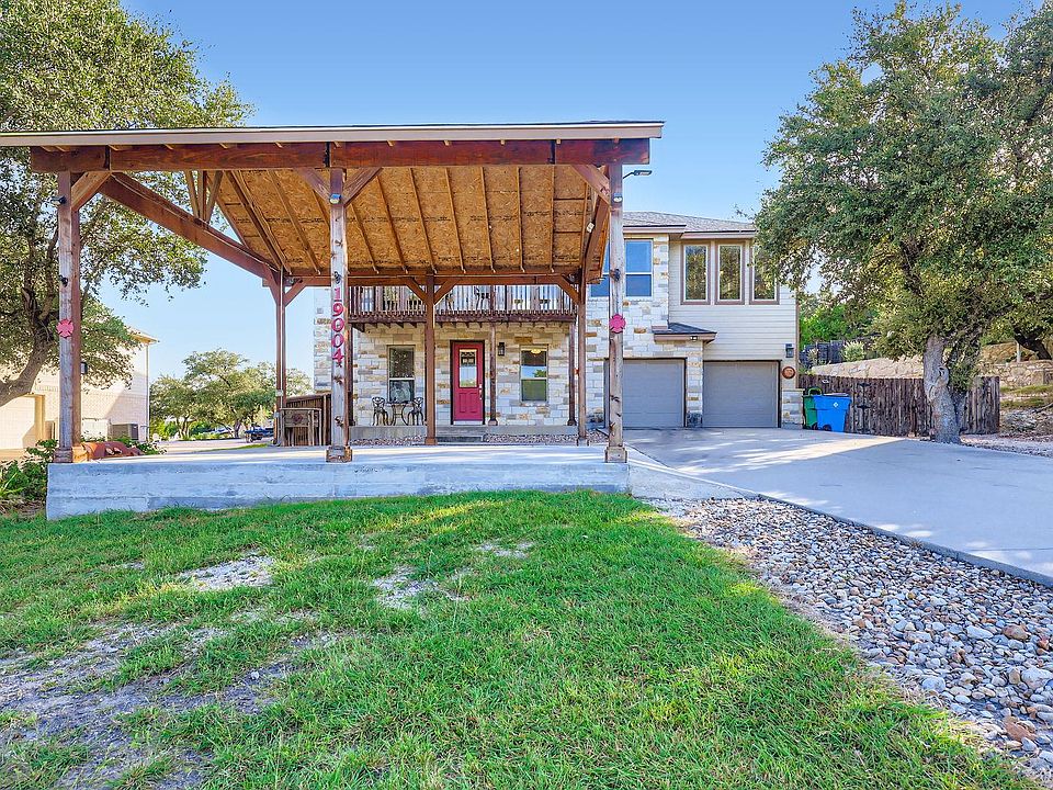 Live the lake life in this immaculate, bright and open Point Venture home. Over/Under floorplan puts the kitchen, living area and primary suite up where the views are while guests and family members can enjoy their own living area, 2 bedrooms and full bath downstairs. Lake life means lake toys and this home delivers with a large carport in front and larger open parking behind the privacy fence on the side yard in addition to the 2 car, attached garage. No toys? Then utilize the carport as a shady spot to relax and enjoy the Hill Country and lake breezes. The open floorplan upstairs takes advantage of elevation for plenty of sunlight and peekaboo lake views from multiple vantage points, including the second story deck off the kitchen and covered front porch directly accessible from the living area and primary suite. Easily entertain friends and family from the bright kitchen with large island and breakfast bar that flows right into a larger dining area. The living area is just as inviting and warm, complete with wood burning fireplace and stone hearth, wall of windows and access to the covered front porch. Escape to the primary suite with full bath including soaker tub and separate shower, large closet, and access to the front deck. Don't overlook all that Point Venture has to offer as well. This vibrant lakefront community is packed with parks, marina and yacht club, on the water dining, golf, tennis, pickleball and gym and a recently added market and grill and more. This house has been very lightly lived in, meticulously maintained and is ready to delight you at every turn!