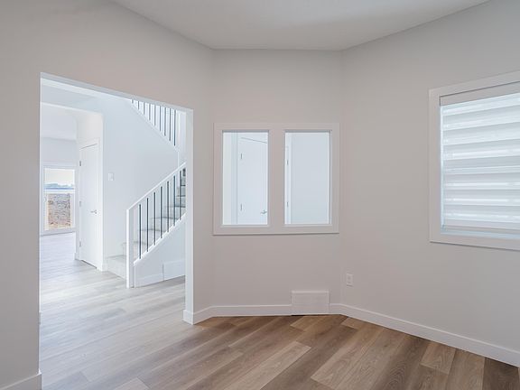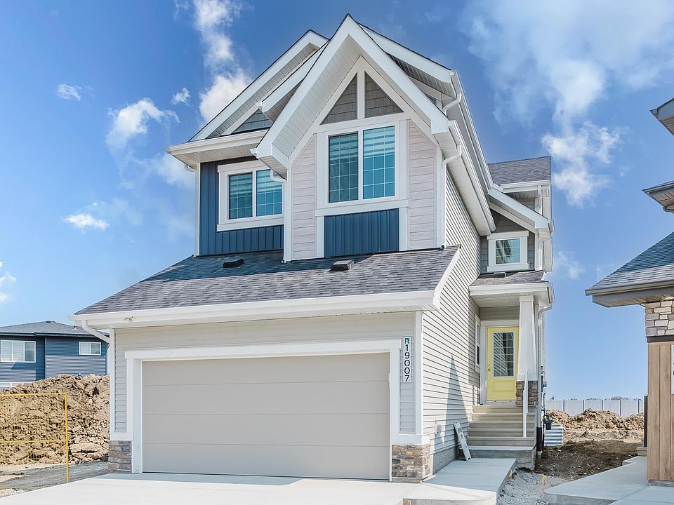 Welcome to the Allure by Look Master Builder — a stylish 3-bedroom, 2.5-bath two-story set on a spacious pie lot in picturesque Rivers Edge. Step into the bright, open-to-above foyer and discover a main floor designed for both style and function. The modern kitchen boasts a central island with seating, Silgranit sink, melamine cabinets with crown molding, soft-close doors and drawers, full-height backsplash, and a walkthrough mudroom and pantry. The cozy great room features an electric fireplace, while a versatile den is perfect for a home office. Upstairs, enjoy a generous bonus room, a vaulted primary suite with a spa-like 5-piece ensuite, two additional bedrooms, a full bath, and convenient laundry. Highlights include 9' main floor ceilings, $5,000 PRE-GST appliance credit, poplar railing, and triple-pane windows. A separate basement entrance offers future development options. Nestled on a quiet street with quick possession available — your next chapter starts here at Rivers Edge.