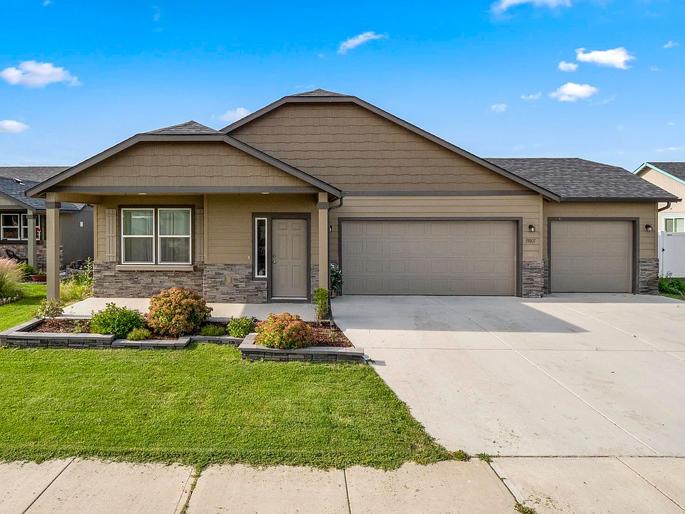Beautiful one-level rancher that boasts 1595 sq ft of living space. $60,000 in upgrades Great open floor plan vaulted ceilings,sculpted hard wood floors, custom blinds, gas fireplace. fabulous kitchen space lovely granite countertops. There are large picture sun windows throughout home allowing plenty of natural light. 3 bedrooms 2 bathrooms the primary suite has a large walk in closet and double sinks, custom tile. Conveniently located easy accessibility. Three car attached garage, fenced backyard, covered patio, sprinkler system, central AC. a welcoming front porch this is a must see.