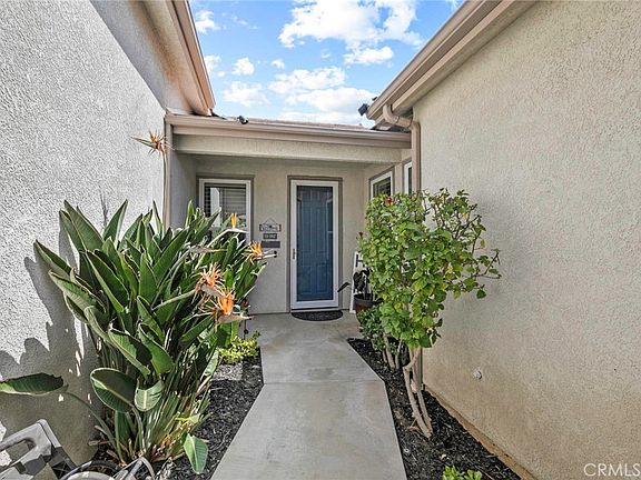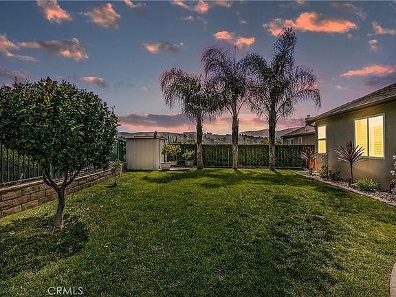 NO MELLO ROOS & Beautiful Turn-Key View Home. The open floor plan features wood flooring, shutters, and crown molding throughout the home. This includes the massive kitchen with KitchenAid appliances and beautifully landscaped front and back yards. This house has been very well taken care of. This single-story home has three bedrooms and two baths. The garage to the right of the house has been converted into an office with private access and its HVAC. The two-car garage on the left of the house has cabinets along the walls. This home is rare because it is one story with privacy. Entering the arched atrium-style front patio through the front door, you notice how well the rooms flow. The high kitchen ceilings have dimmers that adjust the recessed lighting and mood. The kitchen features granite countertops, a large center island with pendant lighting, a double oven, and a butler pantry. A laundry room with a frosted door sits just off the kitchen. The large family room features a cozy fireplace and plenty of room for a large TV and shelves. The primary bedroom is spacious, and its primary bath boasts a closet by California Closets with cedar paneling and a frosted closet door. It has a large tub, double sinks, and a spacious shower. The backyard views of the mountains in the distance are awe-inspiring. There are fruit trees along the back fence. The house is adjacent to the expansive, lushly landscaped bluff, a gradual slope that offers privacy and buffers from other houses. A deluxe-covered patio provides a relaxing space for outdoor gatherings with room for a BBQ grill. The two-car garage has a generator that can be quickly turned on during power outages for immediate power. This single-level view home is immaculate and move-in ready.