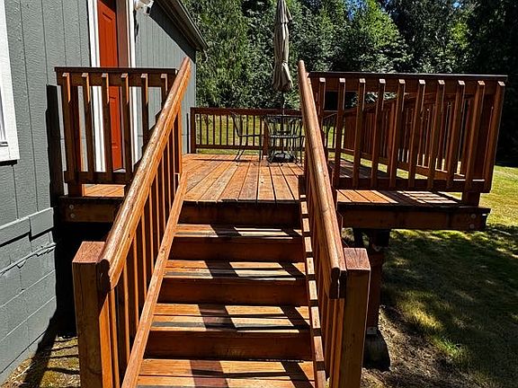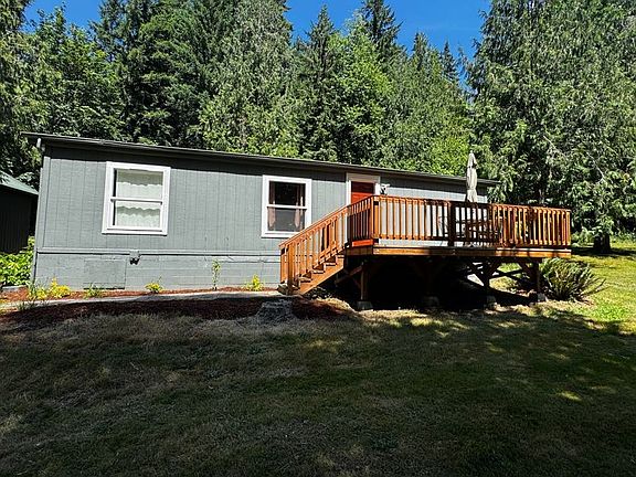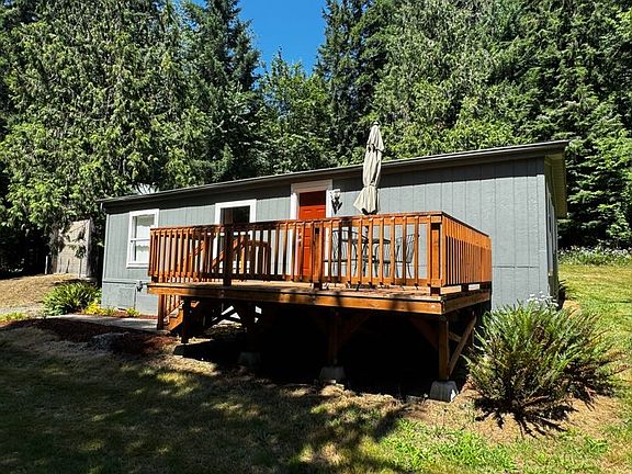 2/2 Home with office, large open kitchen with appliances including washer and dryer. Very private and quiet on 5 acres. Decks on both front an back. Lots of grass and yard space. Dogs allowed. Goats and chickens allowed when penned up. No horses and no ATV's.