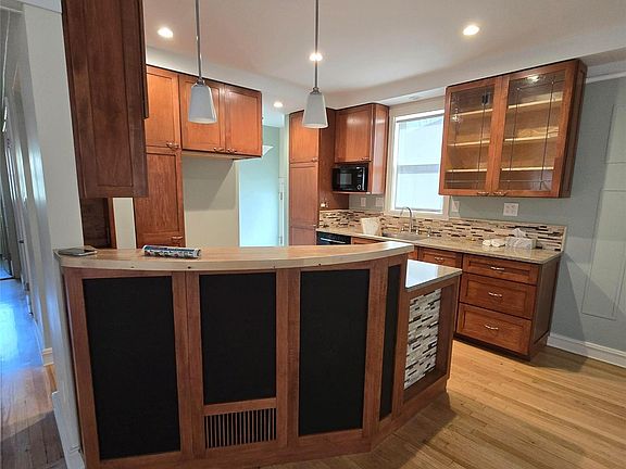 Custom curved islandLovely hardwood floorsNewer hardwood floorsQuartz counter topsWide open floor planBuilt in ovenOpen kitchen