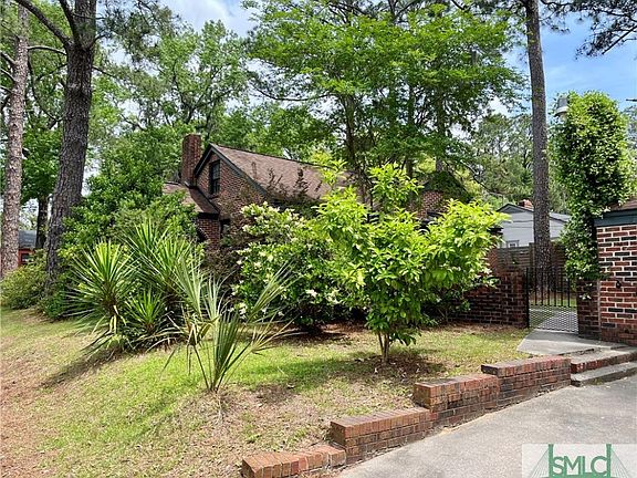 This 1940's French Tudor inspired all brick home offers design and character, follow the intricate brick wall that leads to a detached garage, wrought iron gate and mature landscaping, plus a fully enclosed privacy fence. Inside you will find hardwood floors, a large living room, a sunroom with beautiful arched windows, natural light throughout, decorative interior arches, a separate dining room with french doors that lead to a spacious back porch. Great flow into a large galley kitchen from the porch or dining room. Enter the hallway with 2 bedrooms and a full bathroom, all on the first floor. The finished attic makes a perfect 3rd bedroom, or office, Room for a 2nd bathroom on finished 2nd floor. Perfect location in the center of all that Savannah has to offer. Minutes to Tybee beach or Forsyth Park. Make this your home or the perfect investment property. Some upgrades needed, but this special home is considered move-in condition and is ready for a quick close if needed.