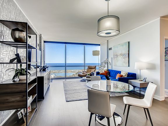 Enjoy beautiful sunrises and fantastic lake views from the floor to ceiling windows in this two bedroom and two bathroom plus den condo. Located in Harbor View, one of the most well-run and beautiful, full amenity buildings in the South Loop! The sleek kitchen boasts 42 inch Snaidero cabinets, stainless steel appliances, upgraded quartz counter tops, and a marble mosaic backsplash. Perfectly laid out, this condo has a true dining area/den, 9' ceilings, spa-like bathrooms, ample storage space, and in unit laundry. The custom built-out closets, electronic window treatments, designer wall paper and private balcony nicely finish off this showroom quality home. Enjoy the luxurious amenity floor including high-end fitness center, posh community room, saunas, and swanky rooftop pool w/cabanas. This pet friendly building also has a well-manicured dog run. Walk to the lakefront, Wintrust Arena, Chicago Women's Park and Gardens, Marriott Food Hall, and all that the vibrant South Loop has to offer. Easy commute to the loop by bus or green line stop just a few blocks away! A deeded prime garage space is available for $35,000. Harbor View is now EV ready for residents who would like to have an Electric Vehicle charger installed! Click on "other media" to view a video of the amazing amenities!