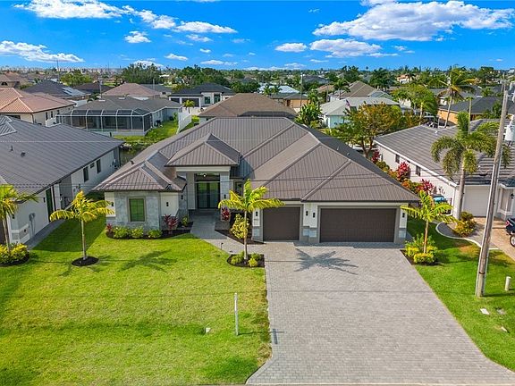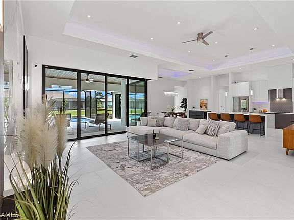 Welcome Home to Paradise! This unique and incomparably designed, New Construction, Waterfront, 5 bedroom, 5 bathroom, Oversized 3-Car Garage, Luxurious Living Pool Home located in SW Cape Coral has countless custom touches and features throughout. This modern and very stylish Gulf Access Pool Home would be like living year round at the Four Seasons Resort & Spa. Step inside through the strong 8-foot steel double entry doors w/privacy glass to be greeted by the cozy ambiance of the open-concept living space. As you enter, you cannot help but notice the seamless and direct view out the back through the large 90-degree corner sliding doors, gazing across the shimmering pool and out the screened lanai to the serene sights & sounds of the relaxing gulf access canal. The open concept home has large porcelain tiles throughout, designer lighting, 13-foot tray ceilings and more than 22-feet of sliders in the main living space. The gorgeous connoisseur’s kitchen has a large 8-foot long by 4-foot wide top level quartz waterfall island, custom high end cabinetry and an upscale stainless steel Samsung appliance package already installed making the perfect triangle. You have a separate 6-foot wine, booze or coffee bar with a dual zone 46-bottle Newair Wine Cooler. Thoughtfully designed, the dining area is located off the kitchen just inside of the outdoor entertaining area. This home is an entertainer’s dream with a custom designed vertical wood slat entertainment wall with a linear LED fireplace. Seamless access from your living spaces to your outdoor oasis where you can't help but relax after a long day on the boat. There is a gorgeous saltwater pebble-tec pool w/sun shelf, covered lanai, marble paver deck, outdoor shower, an adjacent pool bath w/ shower and a designer outdoor kitchen with everything you need to cook a relaxing meal. The primary suite has 11-foot tray ceilings, a comfortable sitting area, custom built his/hers closets and a door leading directly to the pool/lanai. The spa-like bathroom features separate his/her sinks, a large soaking tub, double rain shower heads with linear shower drains and custom built-ins. The four additional guest rooms are all en-suite. One set is Jack n’ Jill, one has glass french doors and can double as an office, while the last has a 6-foot slider with views and access to the pool/lanai. More upgrades than you can imagine include; split zone air conditioning, custom cabinetry w/under cabinet lighting, all bedrooms have custom closets, upgraded faucets and fixtures, linear shower drains, impact windows, impact doors and a metal roof. The triple car garage is a car collector's dream it has an epoxy flake floor with over 20-feet of depth by 30-feet of width and has 10-foot ceilings allowing enough suitable space for high storage. A large paver entryway and driveway. City Water, Sewer and Irrigation are in. Schedule a showing today. We do ask you please remove your shoes or use the provided shoe covers upon entering.