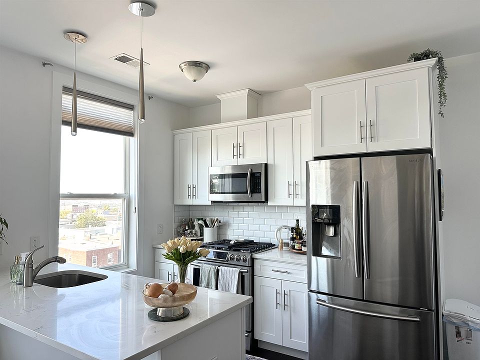 Step inside to this beautiful luxury 2 bedroom 2 bathroom apartment in the heart of Union City. Beautiful high ceilings, with led recess lighting throughout look elegant followed by large windows bringing in an abundance of sunshine. Gorgeous stainless steel appliances go perfectly with the white wood kitchen cabinetry and marble, sit up island counter top. A full size washer and dryer make this place the ultimate home, followed by tons of storage with lots of closets all around. Beautiful marble primary bathroom in the primary bedroom is followed by a spacious walk in closet. Enjoy being a homebody, or get extra active with Union City public library, the Jose Marti Field, Union City shopping center, and much more all right outside your door. Welcome Home!