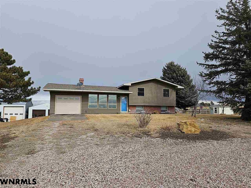 Nice acreage only minutes from town. Updated multi-level home that sits on 3.98 acres with great views of the valley. Plenty of shop/garage space with a 2 stall detached garage and a 5 stall shop. One stall attached garage. Updated kitchen with newer cabinets, wood flooring and newer appliances all included. 3 bedrooms upstairs, all wood floors and newer windows. Updated bathroom with double vanity. Garden level has large living room and additional bedroom. Basement storage area. Covered patio and underground sprinklers in established yard area. Playground equipment included.