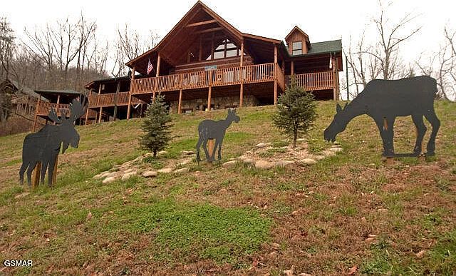 Sitting atop its own private ridge, this true hand-hewn log cabin offers an unforgettable Smoky Mountain experience with 3,277 sq. ft., 3 bedrooms, 5 bathrooms, and a spacious bonus room. Every bedroom boasts long-range mountain vistas, and the home's 3 levels provide abundant space to spread out, relax, and enjoy. Nothing was spared in the building or decorating of this one-of-a-kind retreat, complete with high-end furnishings and thoughtful design details throughout. The main level welcomes you with soaring ceilings and a dramatic chandelier in the great room, where a wall of windows frames the mountains in spectacular fashion. A grand stone fireplace with floor-to-ceiling stonework and hearth serves as the centerpiece, surrounded by leather seating—including a loveseat lounger and plush couch—creating a cozy and inviting atmosphere. An open dining area and fully equipped kitchen make gathering easy, while two generous bedroom suites provide comfort and privacy. Step onto the expansive deck—accessible from both suites and the great room—for breathtaking views. Relax in log chairs, rockers, or the swing, or head around to the side patio where you'll find a grill, Green Egg smoker, and a beautiful outdoor stone fireplace surrounded by log furnishings. A child-sized table and chairs create a sweet play area for little ones, while a separate hot tub pavilion offers the ultimate relaxation with incredible views. Upstairs, the loft provides a welcoming game area, accented with whimsical stuffed bears tucked into the rafters and custom ironwork railings. Two more private bedroom suites on this level continue the tradition of space, style, and sweeping views. The lower level is designed for fun and entertainment. A tiered theater area with large-screen TV is ideal for movie nights, while a pool table and a dedicated video game room ensure hours of enjoyment. A convenient full bathroom and walk-out patio round out this level, giving guests even more ways to relax and unwind. Offered fully furnished and turnkey, this luxury cabin is already a strong rental performer with Hearthside Cabin Rentals, who have successfully managed it since construction. Whether you're looking for a profitable investment or a private Smoky Mountain retreat, this hand-hewn log masterpiece has it all. Be sure to view the attached Matterport tour courtesy of Hearthside Cabin Rentals.