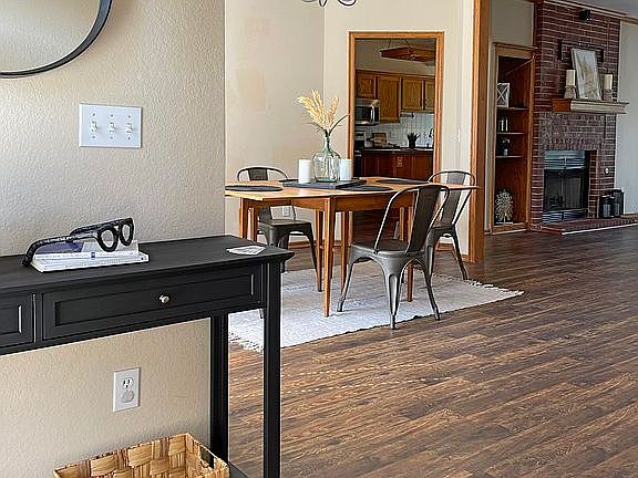 Gorgeous 1.5 story, 4-bedroom, 2.5-bathroom home with amazing open floor plan! Foyer opens to spacious living room and separate formal dining room. Master suite on main floor has vaulted ceiling and access to outside covered patio. Three bedrooms upstairs with full bathroom. Rich colored wood-laminate flooring is scratch-resistant, adds warmth to main living areas. Kitchen has updated stainless steel appliances, an entire wall of added storage, a center island, eat-in breakfast nook, vaulted ceilings, and bay window. Living room has fireplace & ceiling-mounted HD projector, remote-control screen and surround sound! This home has a backyard perfect for entertaining with a custom stone patio and fire pit. Beautiful curb appeal makes this one easy to call your next home!