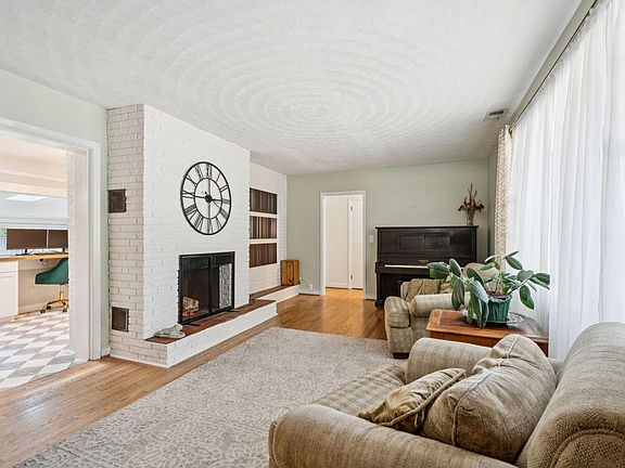 Wood-burning brick fireplaceCovered front porchMature treesOversized family roomHalf an acreExposed brick wallGas cooktop oven