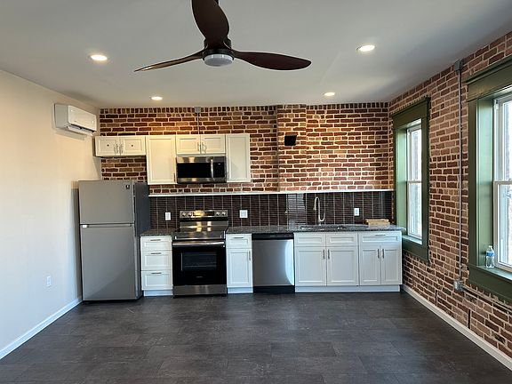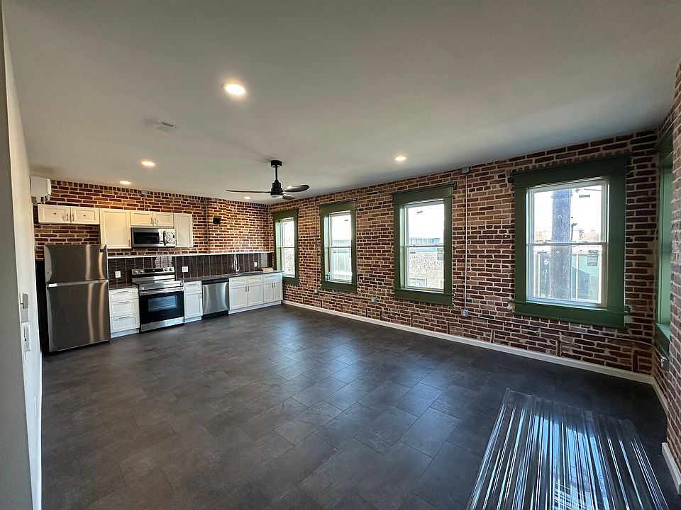 Brand new flat, recently completed in a total renovation of the second floor of this building. All new windows, appliances, carpet, flooring, tile, paint etc. 2 bed 1 bath apartment, second story walk up with secure parking included. Ceiling fans in every room, brand new mini split HVAC, granite countertops, exposed brick, custom window casings, brand new blinds, and designer kitchen cabinets. Brand new bathroom with a high end double vanity, laundry room and storage with a stack unit laundry center. Private building above ground floor retail, lots of big windows and good natural light. Owner pays water and sewer, tenant pays all other utilities, no gas appliances so no gas bill. Available 12/12/2025 - reach out for a tour and December rent specials! 12 month lease