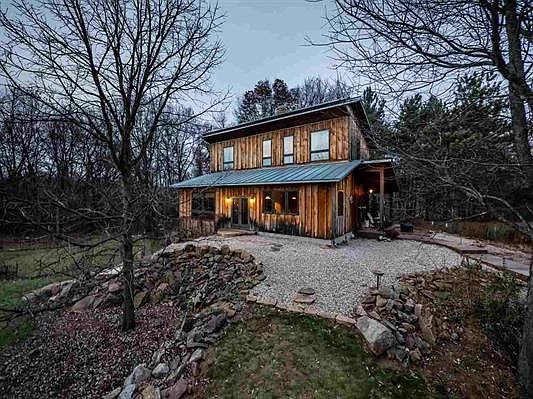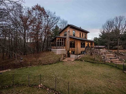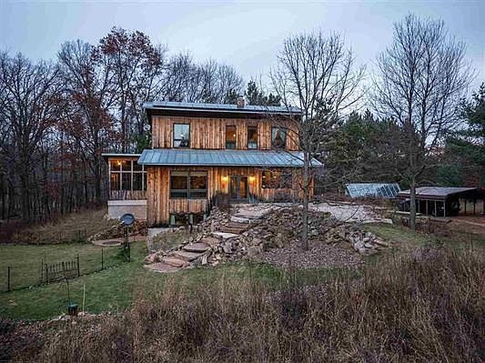 The Wisconsin River meets this Custom Green Built Contemporary 2 Story on a maturely forested 45 acres.Enjoy nature year round with 1400 feet of fabulous waterfront and the privacy offered by this home's "end-of-the-road" location. Built by Gimme Shelter Construction, the home features a variety of energy efficient systems. A roof top Solar Photovoltaic (PV) array supplies electricity while the ground mounted Solar Thermal panels supply hot water for both domestic and radiant in floor heating. With it's passive solar design, stained concrete floors, super-insulated plaster walls, and wood-fired masonry heater, this home is designed to keep you comfortable no matter what the season! This is a rare property to have acreage and water frontage on the Wisconsin River, so if you are looking for privacy and seclusion with all the amenities of water front living, this is it.