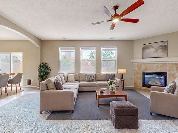 Welcome to this charming four-bedroom, two-and-a-half-bath residence in desirable Rio Rancho. The heart of this home features a well-appointed kitchen with stainless steel appliances, abundant cabinet storage, and a convenient pantry. A living area plus an additional loft and a formal dining room provide versatile spaces for both entertainment and relaxation. The primary bedroom suite offers luxury amenities including a separate shower and tub, plus dual sinks. Fresh carpet and paint throughout enhance the modern appeal, while a cozy gas fireplace adds warmth to the living room. Make this beautiful home yours today!