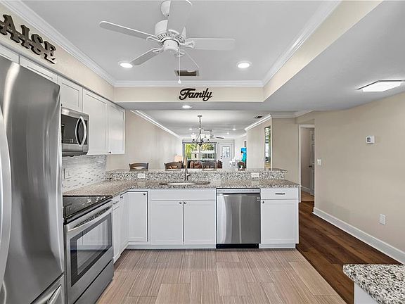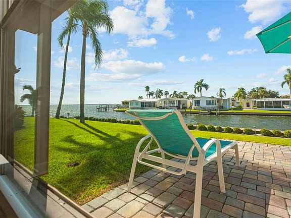 Welcome to your waterfront paradise at Imperial Cove, a gated 55+ community in Clearwater, Florida. This stunning 2-bedroom, 2-bath villa-style condo has been meticulously renovated to offer the perfect blend of luxury and comfort. Enjoy breathtaking views of Old Tampa Bay and the Bayside Bridge from your private paver patio, ideal for morning coffees and evening wines while watching passing Manatees and Dolphins. This end-unit villa features an open floor plan with water vistas extending from the gourmet kitchen with stainless steel appliances, granite countertops, and glass tile backsplash to the spacious living area framed by large windows. The home boasts brand-new luxury vinyl plank flooring throughout (December 2024), complemented by tile in the baths and kitchen. The primary bedroom overlooks the water and includes dual closets, a beautifully updated ensuite bath with dual sinks, and a split bedroom layout offering privacy. The secondary bedroom is light-filled and situated conveniently next to the guest bathroom. Additional highlights include crown molding, a 2020 A/C replacement, tankless water heater, storm door, water softener, updated windows, and renovated bathrooms with modern tile, lighting, vanities, and glass doors. Hurricane storm shutters ensure peace of mind on the canal side A covered assigned parking space with storage and ample guest parking are included. The community amenities are unparalleled, featuring a large heated pool, shuffleboard, putting green, fishing pier, and a two-story clubhouse with billiard tables, library, card room, fitness rooms, saunas, and a second-floor ballroom for social gatherings. The maintenance fee covers water, sewer, trash, exterior maintenance, grounds, roof, cable, internet, insurance, flood insurance, and recreational amenities. Imperial Cove offers an active lifestyle with a social director coordinating various activities, along with a lighted walkway overlooking Bayside Bridge for scenic walks along Old Tampa Bay.