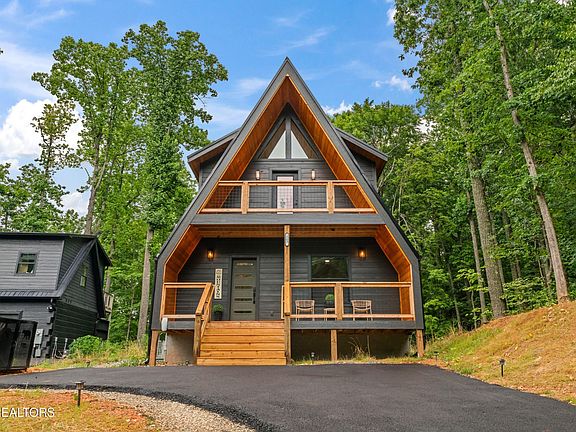 Discover this stunning 2024 build- fully furnished, 1.5-story A-frame cabin in the highly sought-after Sky Harbor subdivision of Sevierville, TN! Perfect as a short-term rental or private mountain retreat, this 2-bedroom, 2-bath cabin combines modern comfort with rustic charm. The main level features an open-concept floor plan with luxury vinyl plank flooring, beautiful wood walls, and stylish black windows and doors. The cozy living area includes a ventless fireplace and large windows showcasing peaceful mountain views. The kitchen stands out with modern blue cabinetry, stainless steel appliances, and a seamless dining and living layout ideal for entertaining. A spiral staircase leads to a versatile loft area, while both bedrooms offer plenty of space and comfort. The primary suite features a walk-in shower, and a washer and dryer are included for convenience.