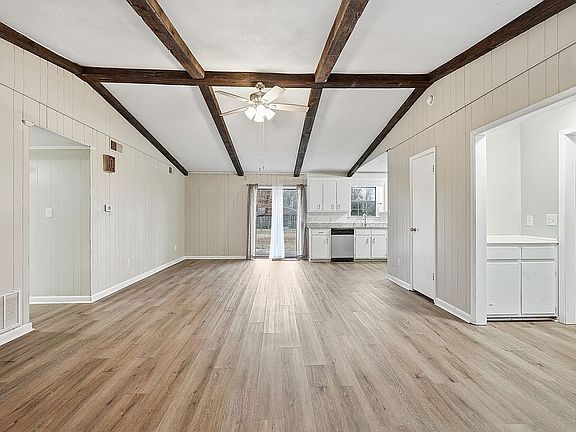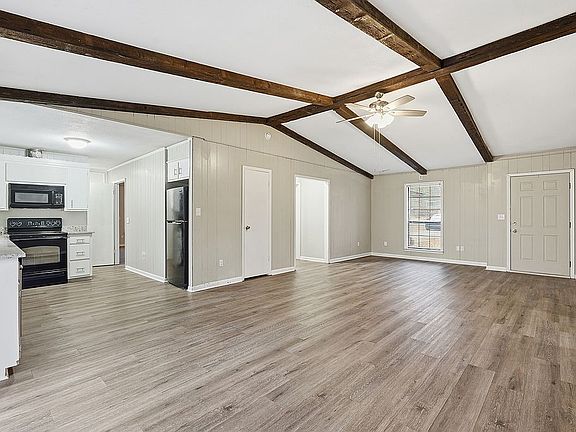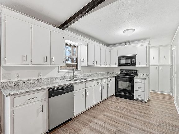 Inside, you’ll find a fully renovated interior featuring luxury vinyl plank flooring, LED lighting, granite countertops in the kitchen, guest bathroom, master bathroom, and modern fixtures throughout. The split floor plan provides both privacy and flexibility, with three generously sized living areas that are perfect for entertaining and relaxing (one could be used as a formal dining room). Enjoy the built in seats in living area one at the bay window with an adjacent vintage wood stove. Living space number two has a built in book case and cozy nook leading into the third living area with tall ceilings and beautifully crafted wooden beams.