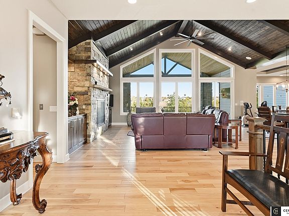 OPEN HOUSE SUNDAY 1-3. Welcome to this stunning custom Baranko 2.638 acreage in Papillion overlooking the serene Walnut Creek Lake where luxury meets tranquility. This dream home showcases exquisite craftsmanship and high-end upgrades throughout, including custom-engineered wood flooring, vaulted ceilings and elegant granite countertops. Enjoy the peaceful patio with a fireplace pit and your very own lap pool/spa/hot tub. Home features 4 spacious bedrooms, 5 baths, 2 main floor laundries and an oversized 6 car+ garage able to fit large RV. Enjoy the peaceful surroundings and abundant wildlife right from your own backyard. The home includes extras such as a tornado shelter, 2 (Hvacs, water heaters) water softener and elevator. The open-concept main living area flows seamlessly to a large covered deck, perfect for entertaining or relaxing outdoors. Experience the best of acreage living with this one-of-a-kind home—a perfect blend of elegance, functionality, and peaceful country charm.