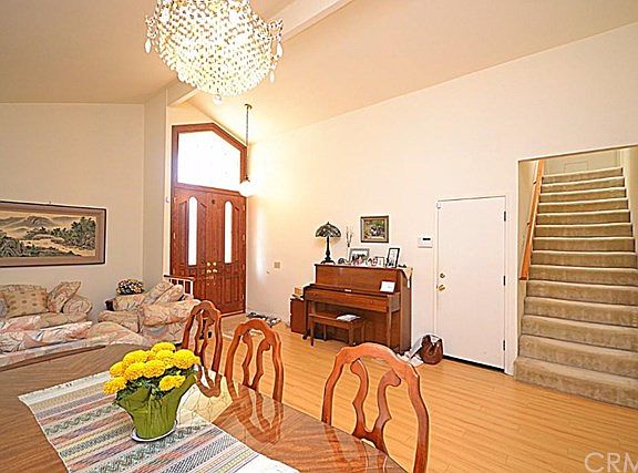 Two story home at Culdesac with nice and quiet neighbors with great schools, high ceiling with fire place in living room, double door entry, good quality of tile roof, electric awning, separate family room, two master bed rooms one up stairs and one at down stairs, walk in closet at up stairs master bed room, hard wood floor on living room, family room, kitchen and dining area and all bed rooms has carpet flooring, low maintanance for back yard, 3 bed rooms down stairs and two bed rooms up stairs. close to shopping, park and easy access to freeway.