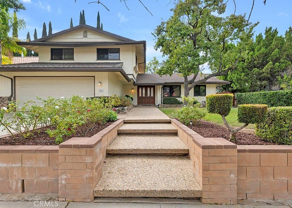 Wonderful 5-bed, 3-bath home with 2,450 sq ft of living space, perfectly positioned in a desirable neighborhood with a stunning mountain backdrop. Great curb appeal with distinctive wood siding and stone details, lush green lawn, hedge borders, and mature shade trees. A welcoming double-door entry, accented by decorative glass, opens to a formal tiled entryway with decorative tile rug. The interior is freshly painted throughout and sets a bright and move-in-ready tone. A large, open-plan living space is filled with natural light from floor-to-ceiling windows while a statement fireplace anchors the generous living room, which flows effortlessly into the adjacent dining area with a glass slider that leads to the backyard. The kitchen combines classic function with modern updates and an inviting atmosphere, offering granite counters, a tile backsplash, and stainless-steel appliances including a built-in oven and microwave, and a cozy breakfast nook for informal dining. Two downstairs bedrooms, which share a well-appointed full bath, both with mirrored closets, one with a glass slider out back, offer flexibility, creating opportunities for a home office, guest suite, or conversion into a spacious den or bonus room. Upstairs, the primary suite features dual closets, an en-suite ¾ bath with dual sinks, a separate vanity area, and a tiled shower. Two additional good-sized bedrooms with mirrored closets share a full hall bath. Outside, the yard makes the most of the over 8000 sq ft lot with a wide concrete patio, a covered seating area, and an expansive lawn bordered by mature landscaping, creating a perfect canvas for outdoor gatherings or personalization. The home boasts an attached 2-car garage, with brand new garage door opener and laundry hookups. Well situated in the foothills of Porter Ranch, near highly rated schools, parks and natural spaces, shopping, dining, and entertainment. Don’t miss out on this home with exceptional potential in an outstanding setting.